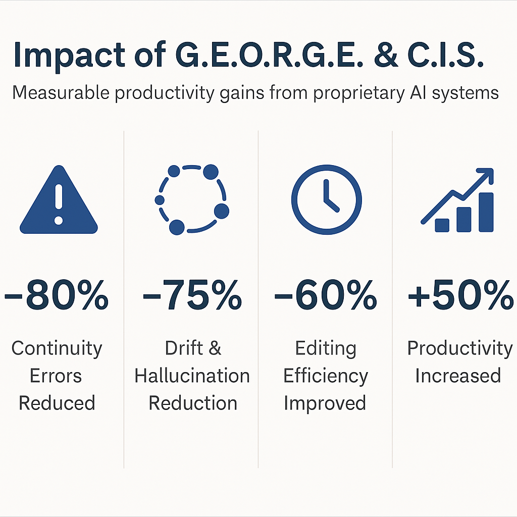 Since implementing the G.E.O.R.G.E. + C.I.S. stack, I’ve seen a dramatic improvement in speed, accuracy, and output across all stages of the creative process:✅ Continuity errors dropped by 80%From 3–5 per 1,000 words to fewer than 1—thanks to G.E.O.R.G.E.’s reinforced recall and C.I.S.’s canon locking.🧠 Hallucinations and tonal drift reduced by 75–85%Misaligned or off-canon responses now happen in fewer than 1 in 10 prompts, down from 1 in 4.